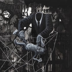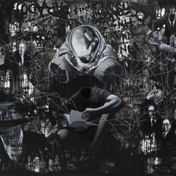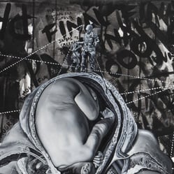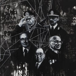 “Nadie vio Matrix” se inspira en el libro homónimo escrito por el economista Walter Graziano. En esta pintura me adentro en el retrato de varios de sus protagonistas. símbolos de distintos momentos históricos aparentemente dispares, pero que tienen un impacto profundo en la regulación de las ideas y la población humana. Algunos de estos episodios incluyen la creación de la Escuela de las Américas, la teoría de las expectativas racionales y el concepto político de la “noble mentira”, difundido por el filósofo Leo Strauss.