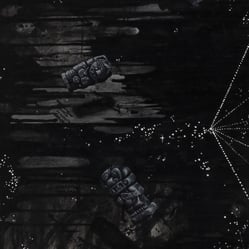 Utilicé acrílico sobre madera, con pinceladas gruesas y abstractas en el fondo para evocar la dinámica espiral del cosmos y trazos meticulosos para los detalles realistas.